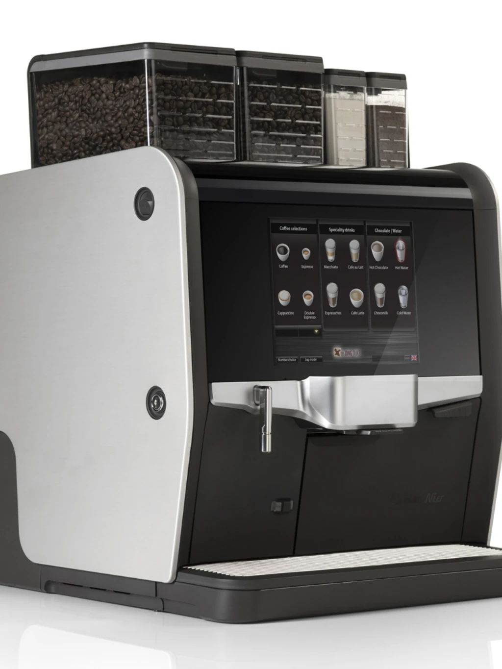 Maskinen har 4 ingrediensbeholdere; 2 til kaffebønner 1 til chokolade og 1 til mælkepulver (også vegansk). Informationsdisplay 10,4” farve touchskærm, hvor det er muligt at tilføje dine egne screensavers.