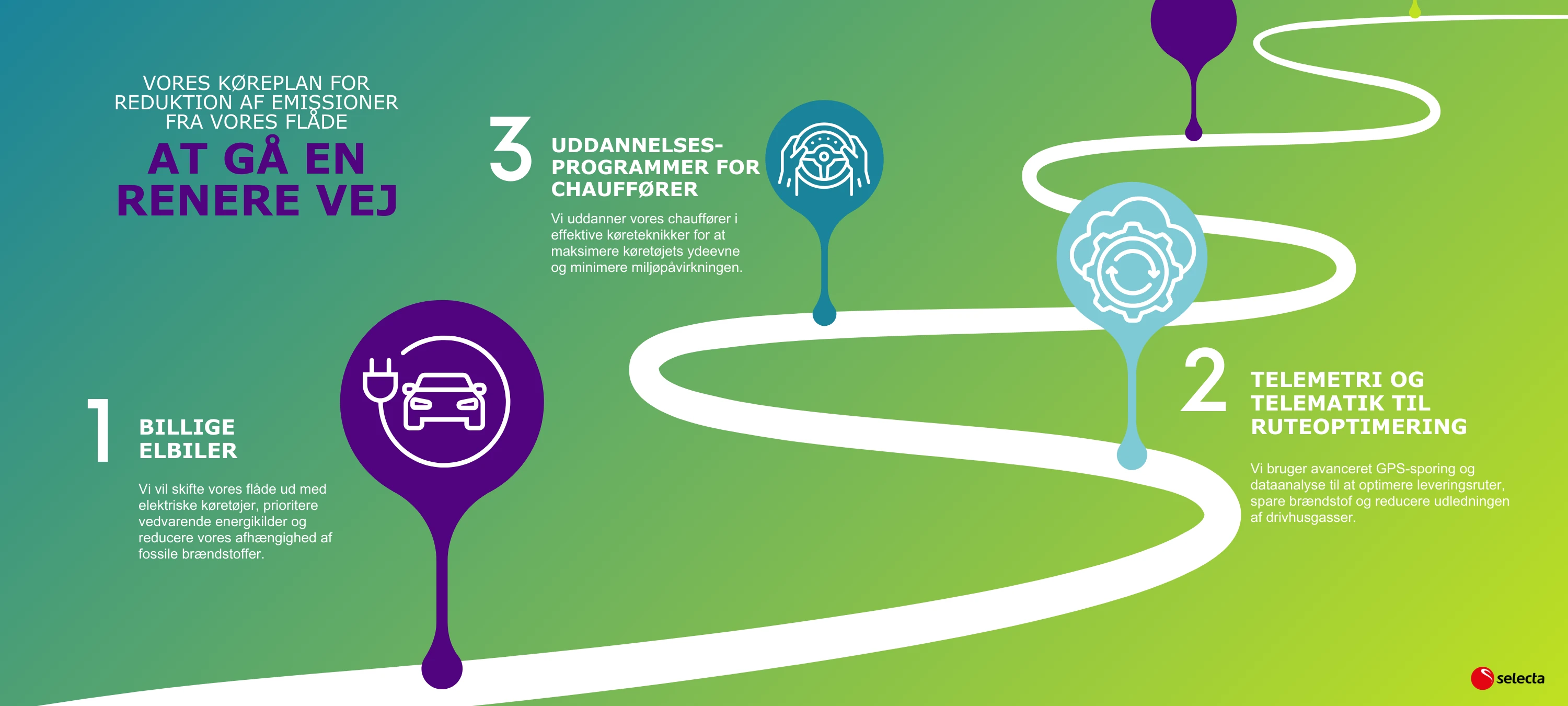 Hos Selecta er vi forpligtet til at minimere vores CO2-fodaftryk, og et vigtigt fokus er at reducere emissionerne fra vores flåde. Vores rejse mod CO2-neutralitet starter med at ændre den måde, vores produkter når frem til dig på.