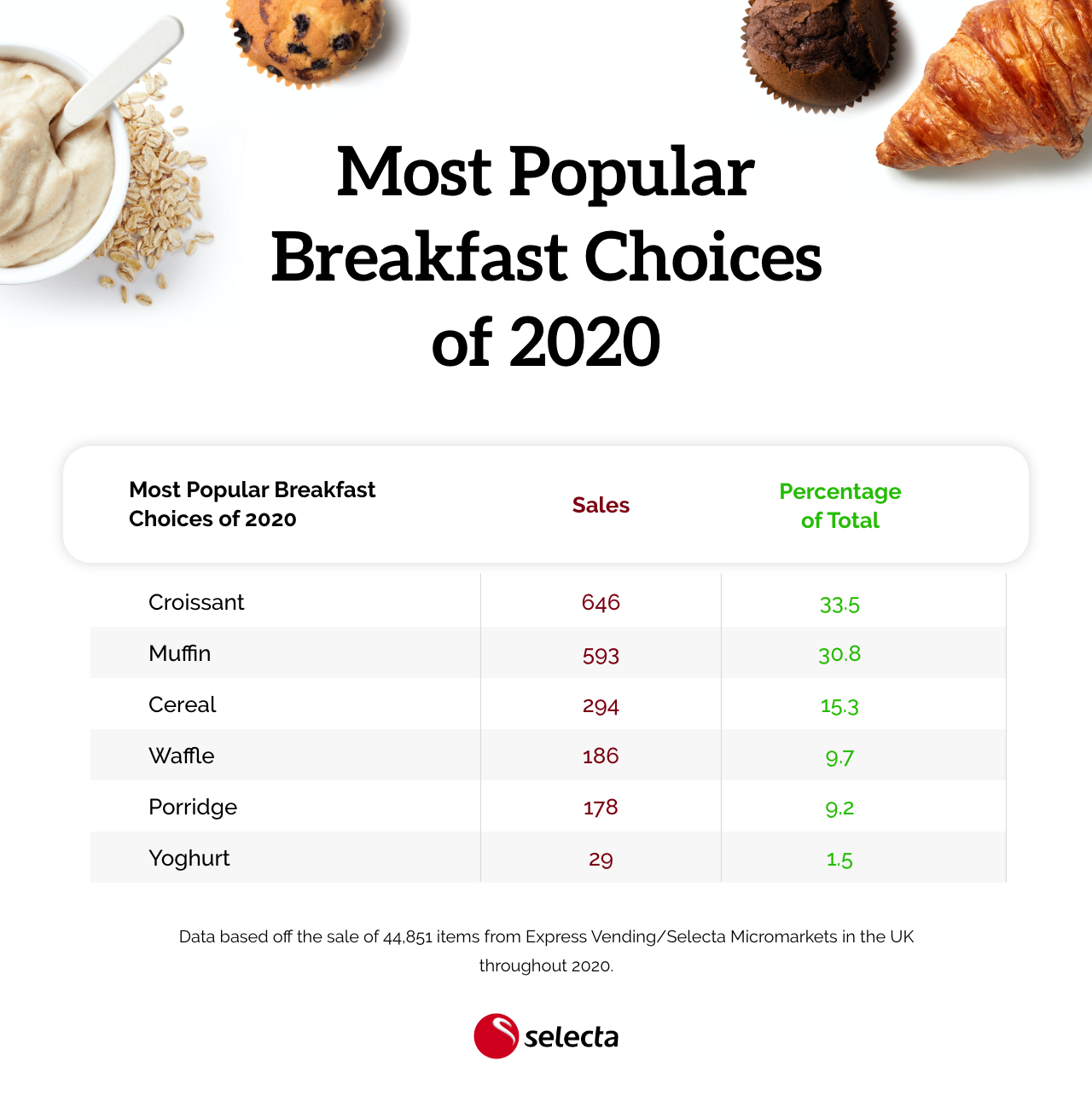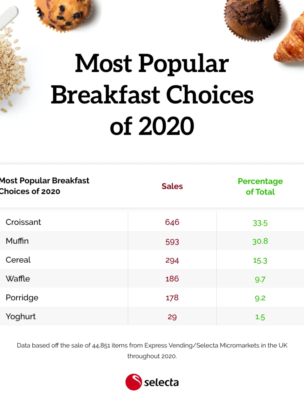 The rise in more portable breakfast options like croissants and muffins – compared with traditional ‘sit-down’ breakfast choices like cereal and porridge – suggests a link to the increasing popularity of ‘breakfast meetings’, which have been linked to increased focus and productivity, compared with lunches or working dinners.