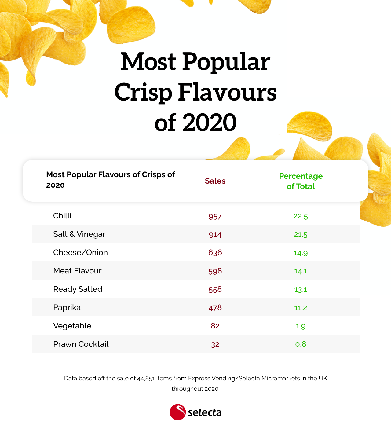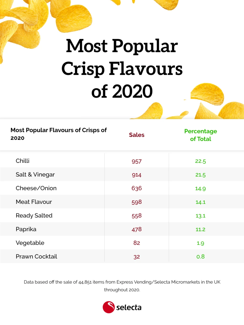 Among the more surprising results was chilli being revealed as the most popular crisp flavour, beating traditional flavours salt and vinegar and cheese and onion, which came in 2nd and 3rd place respectively.