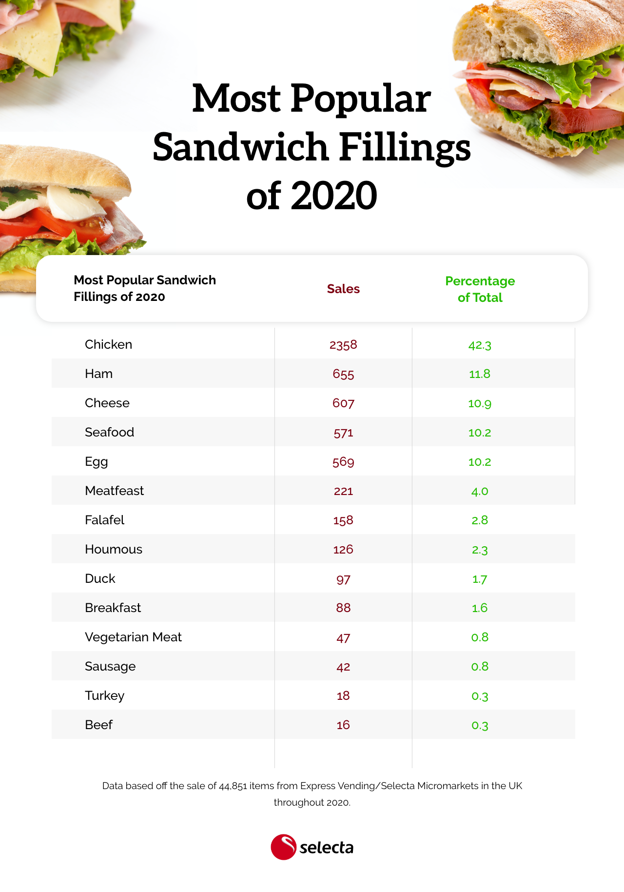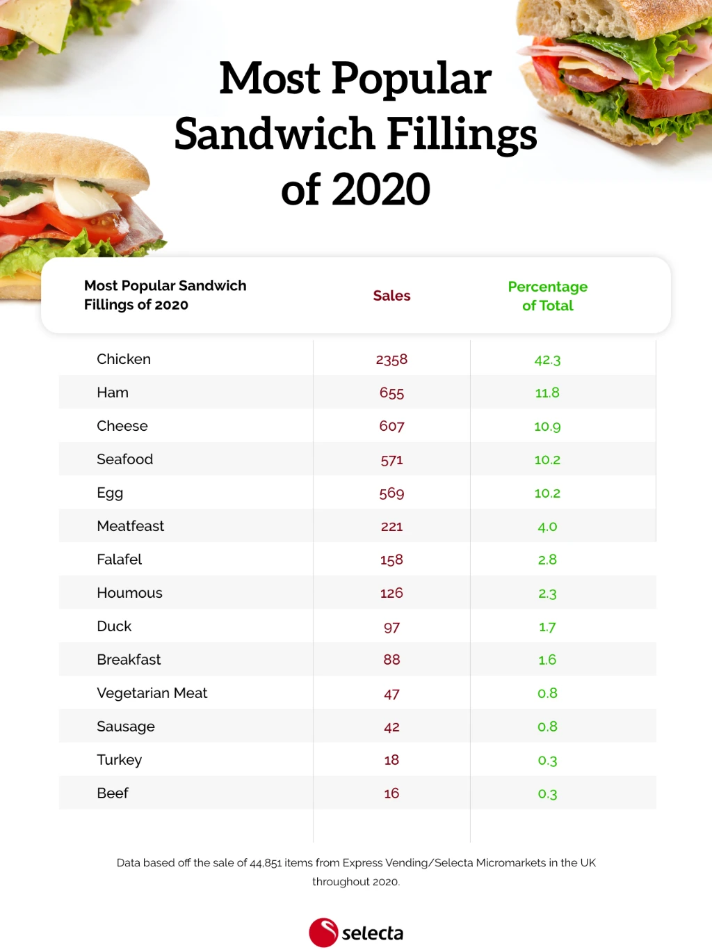 The staple of the British meal deal is the sandwich, with chicken revealed as the nation’s most popular filling, making up almost half of all purchases (42.3 percent). Ham, cheese, seafood and egg make up the top 5 most popular sandwiches choices.
